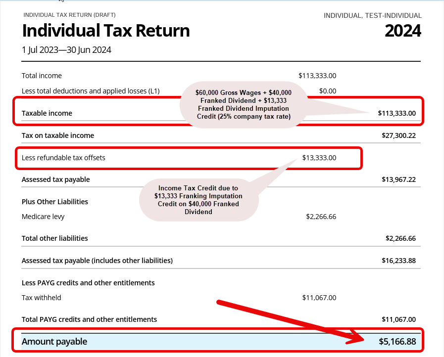 Tax Return Result is $5,166.88 Payable (they are essentially paying $5166.88 income tax (12.9%) on the $40,000 franked dividend due to the franked tax credits even though the taxpayers marginal rate of income tax in 2024 FY is 34.5%)